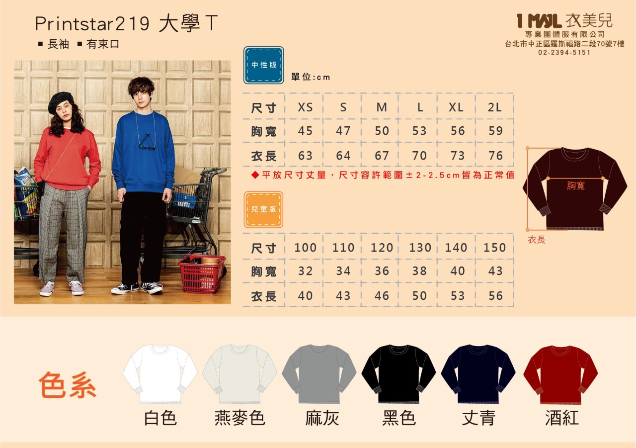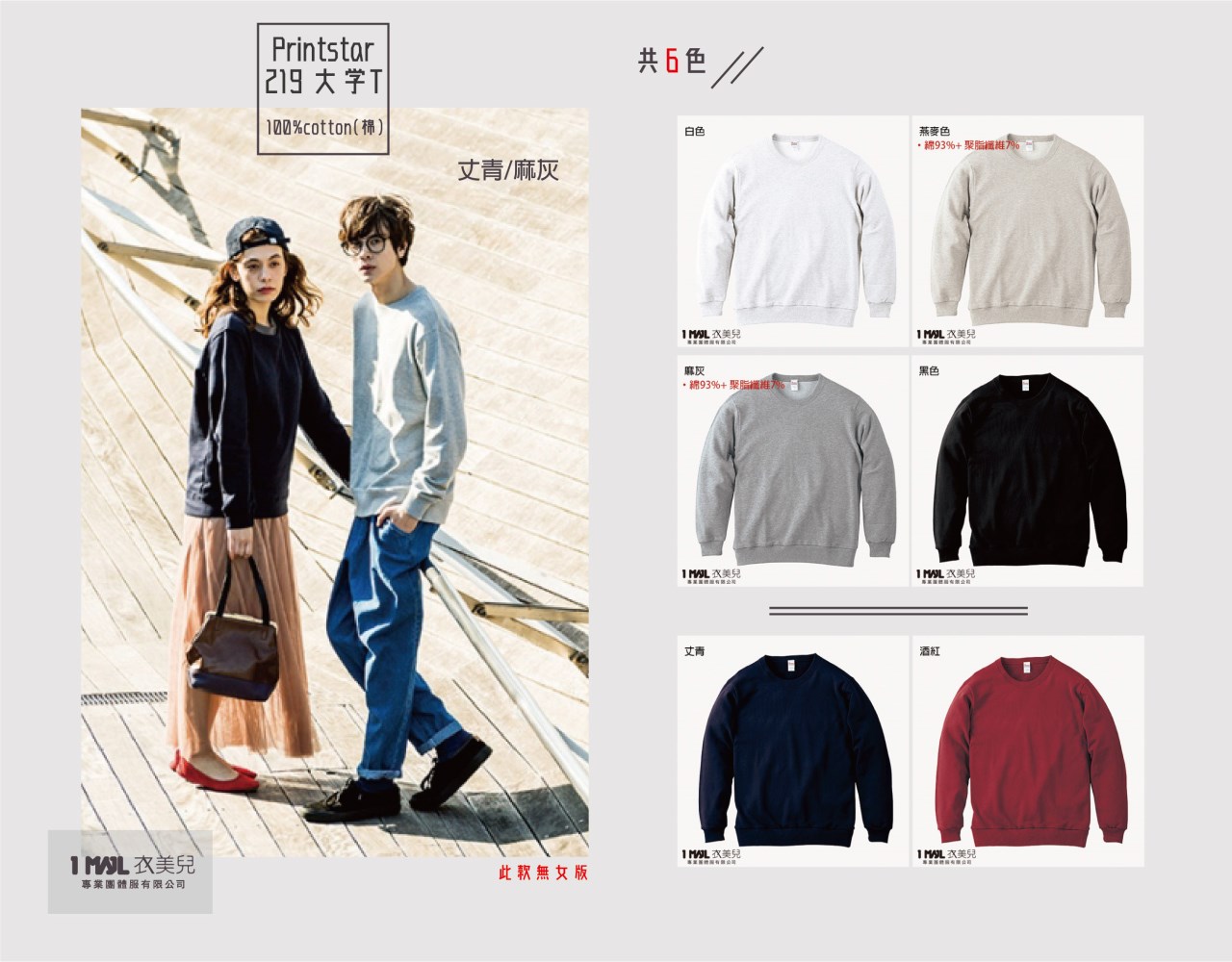 Printstar219大學T(全棉.內裡無刷毛) / 共6色