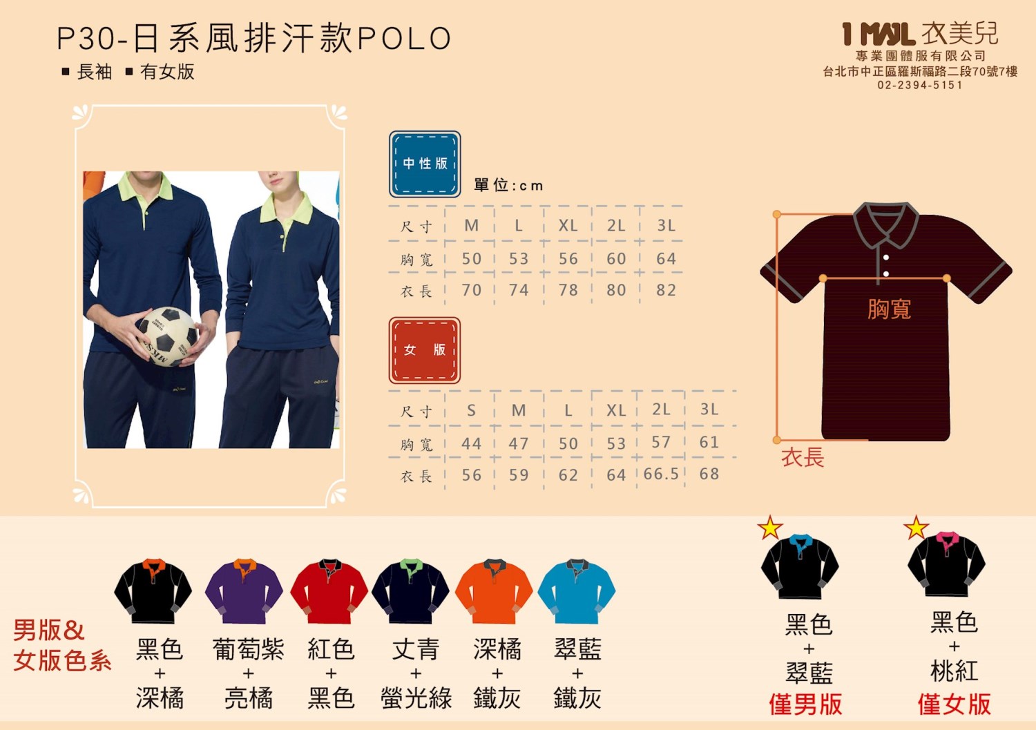 P30-日系風長袖POLO衫(共8色)/100%polyester