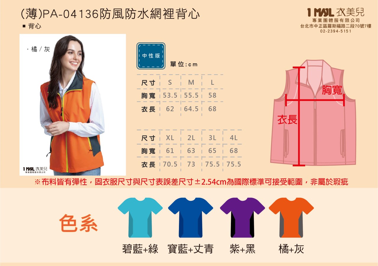 (薄)PA-04136防風防水網裡背心/寶藍+丈青