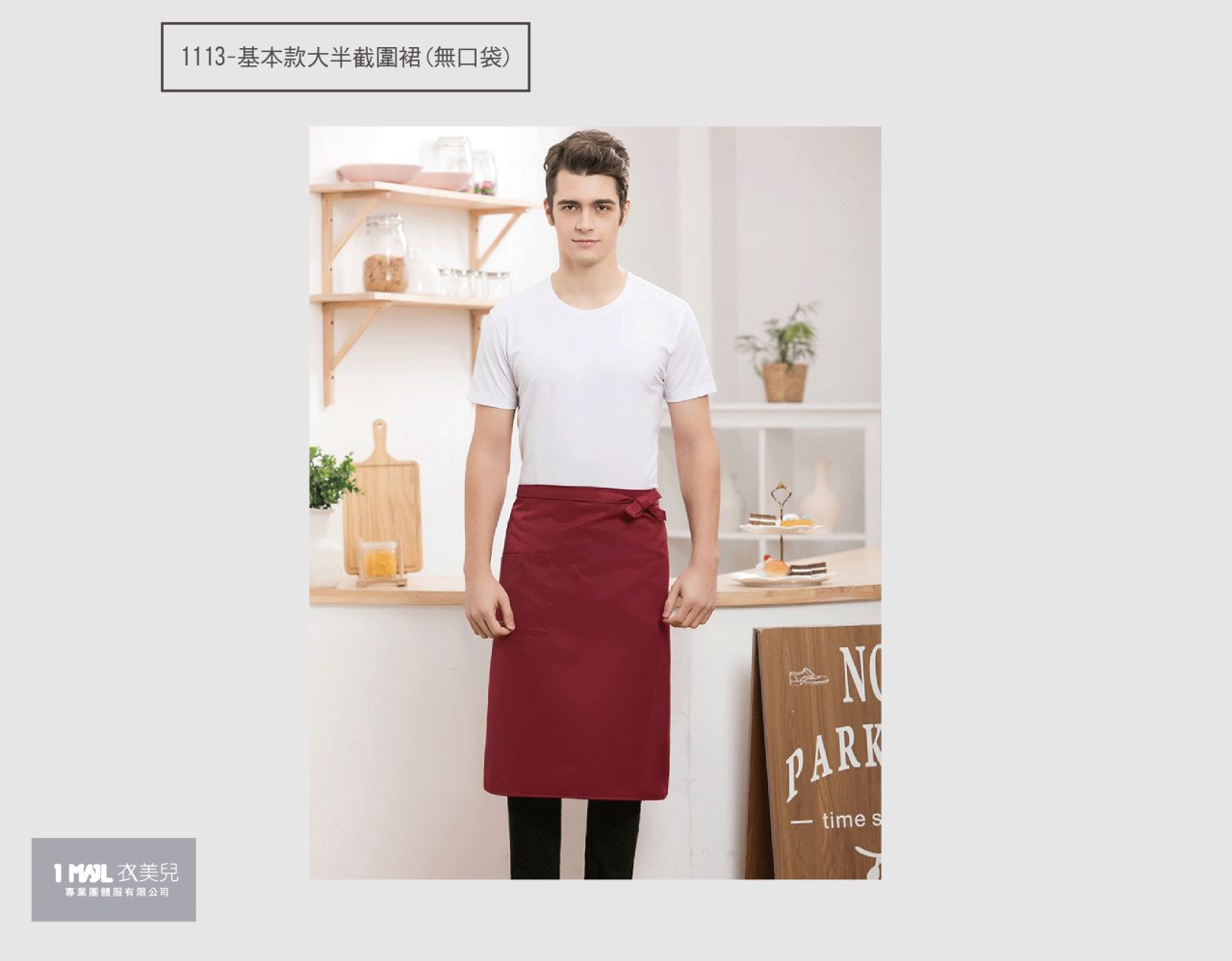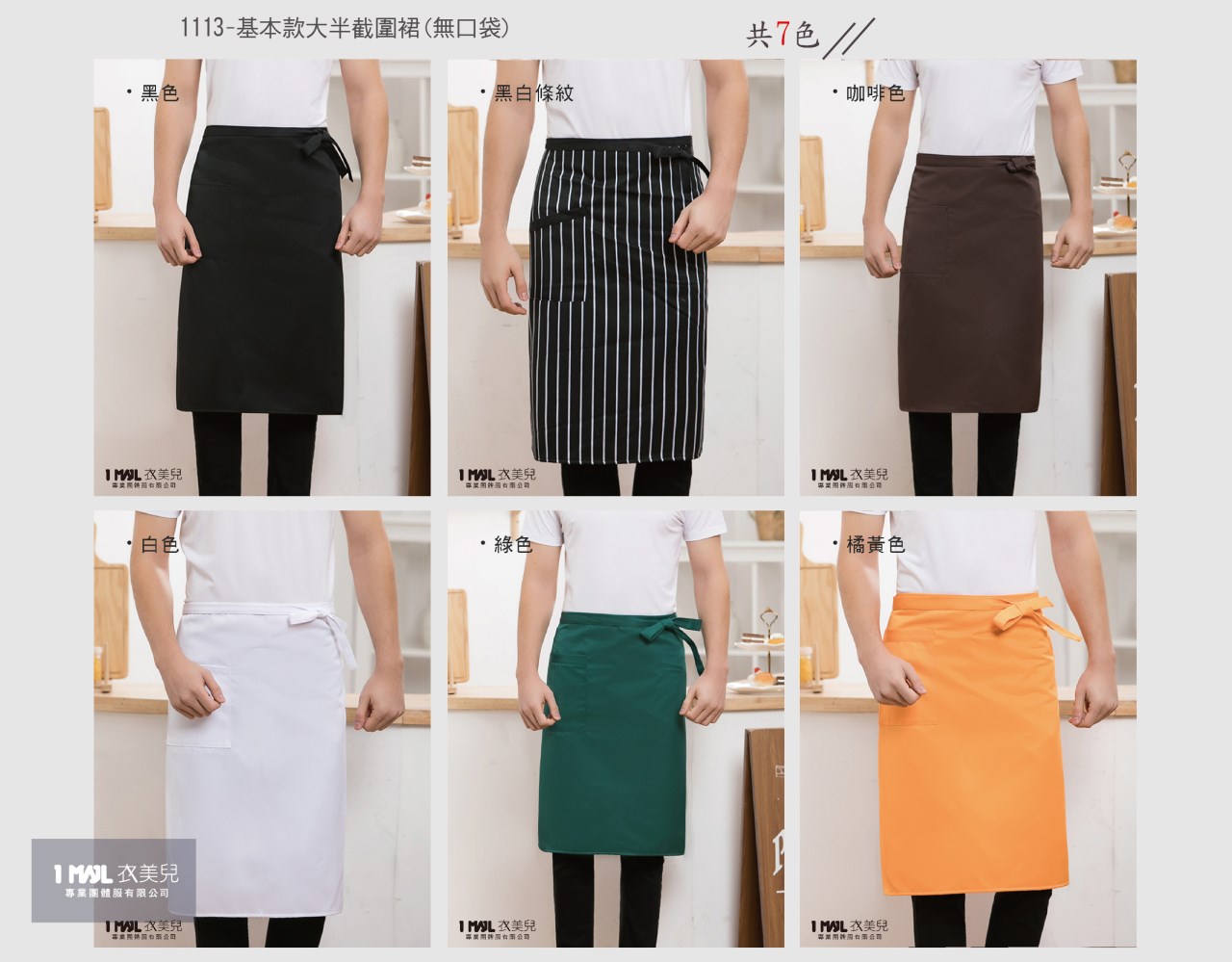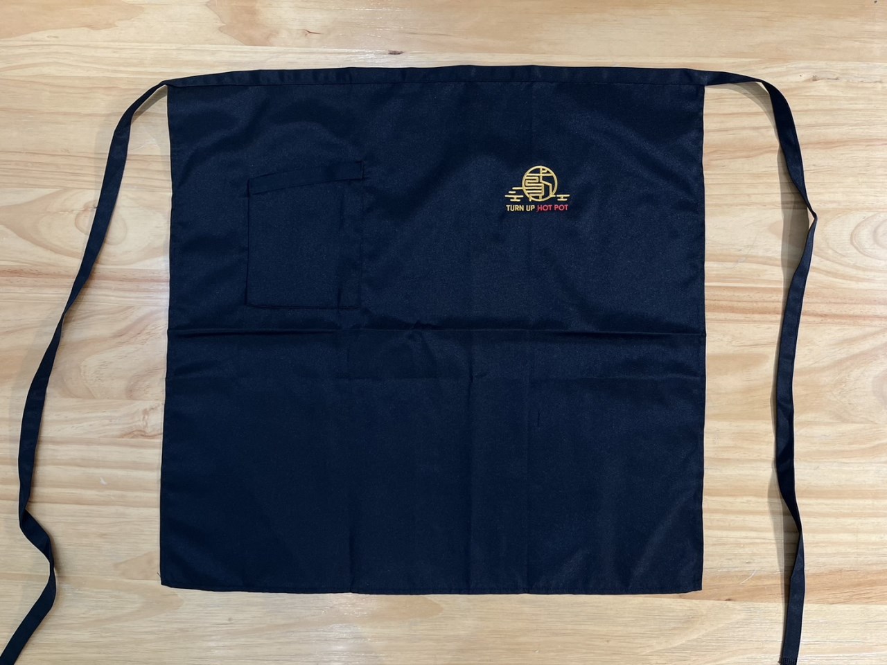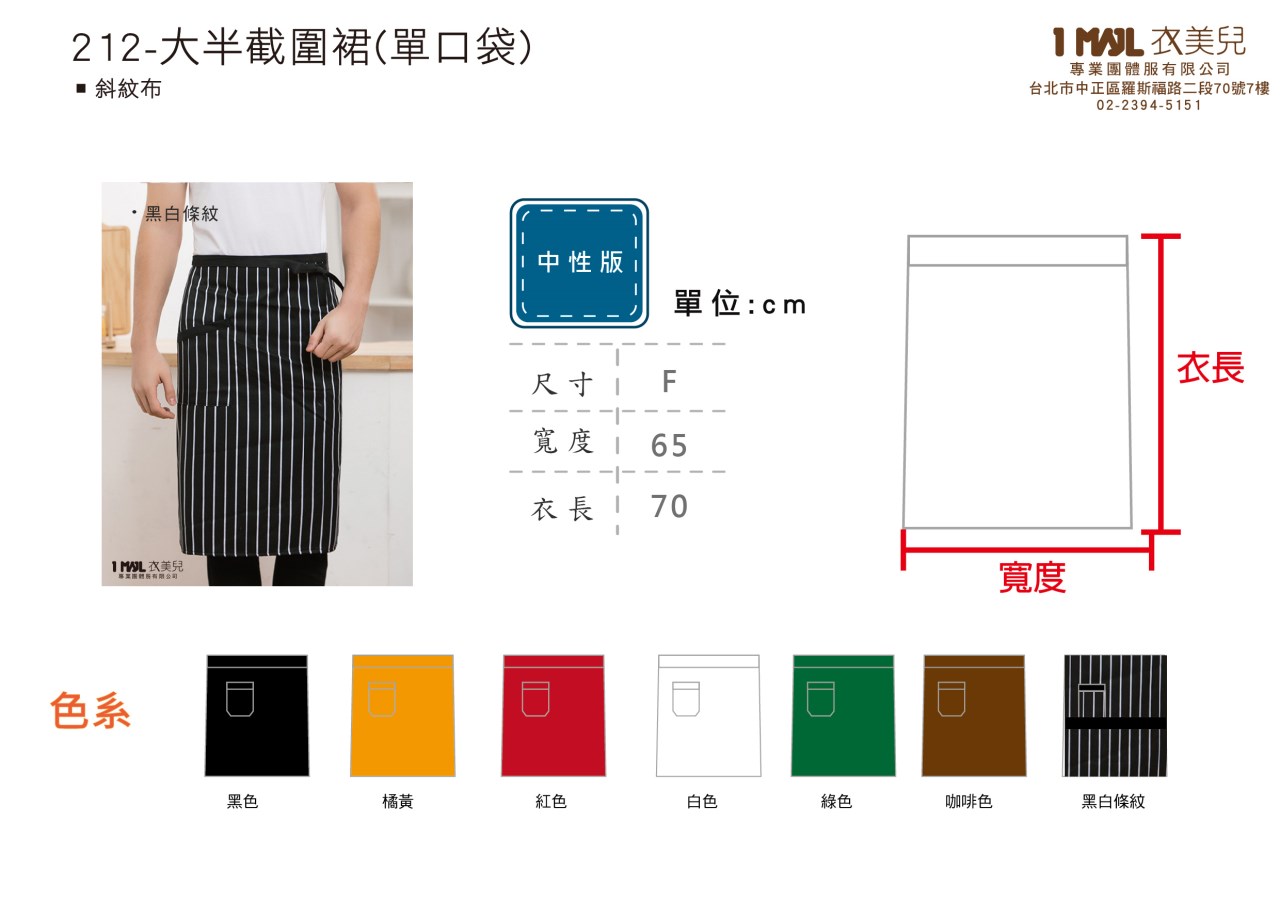 1.大半截式長版圍裙,右側單口袋。適度的隔絕油污、塵垢進入布面,讓各行各業服務人員不怕弄髒。