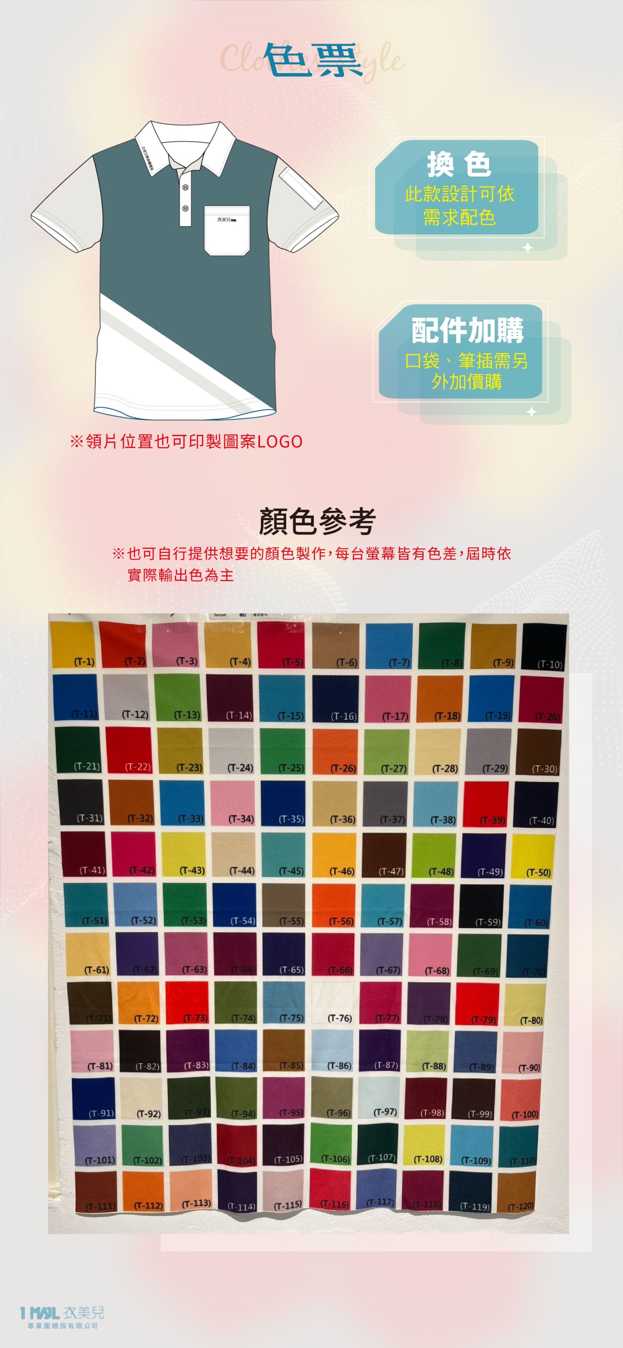 配件加價(每件):口袋+$45;筆袋+$45;數字每件不同+$110/單面(雙面+$220)
