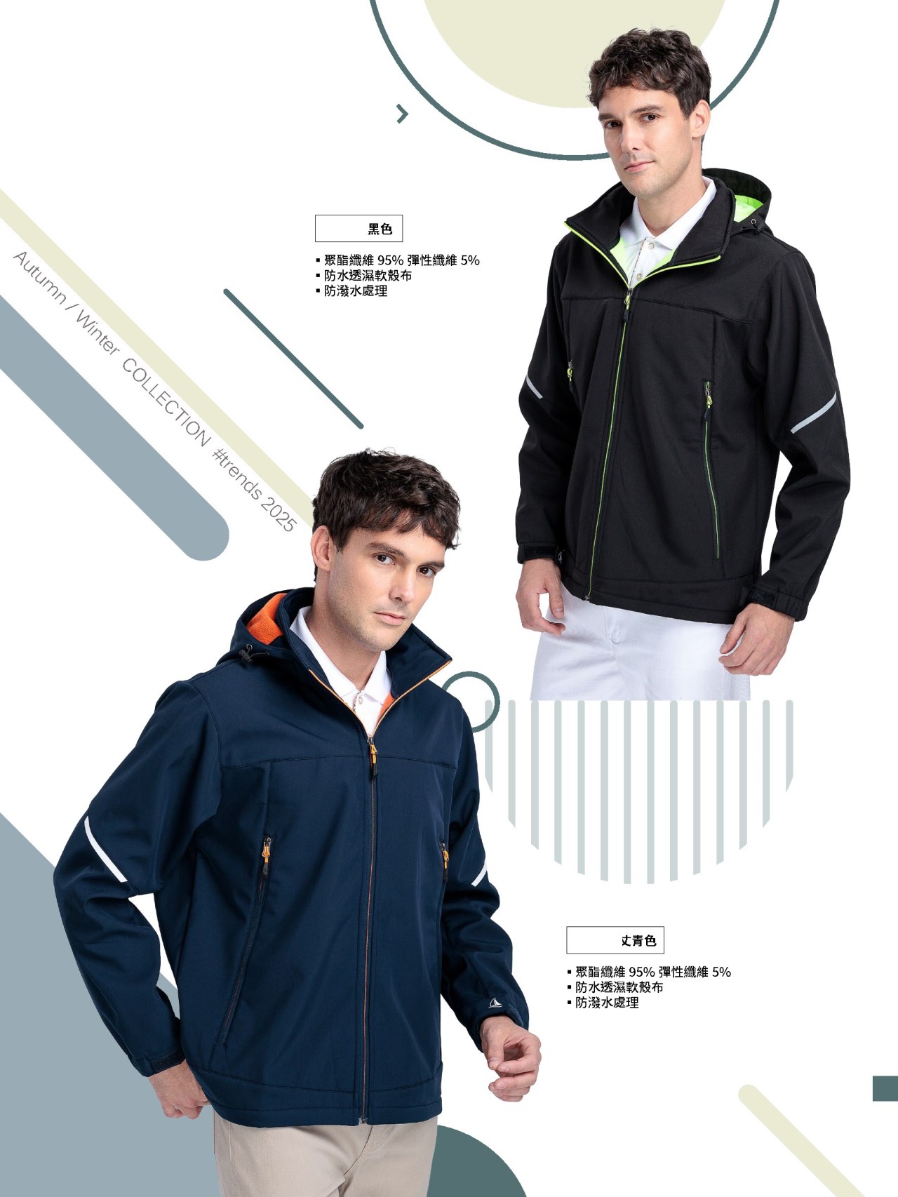 防水透濕軟殼布、防潑水處理(聚酯纖維92%+彈性8%),適合秋冬,保暖舒適、時尚質感,提升專業形象。防風防寒,完美的立體剪裁展現挺拔身型。