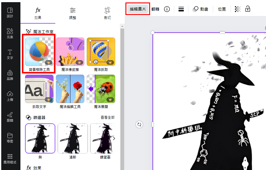 點選版面上白底欄位中的「編輯影像」可以直接做線上去背。另外也可以套入「濾鏡」、「邊框」、加上「陰影」等,非常方便。