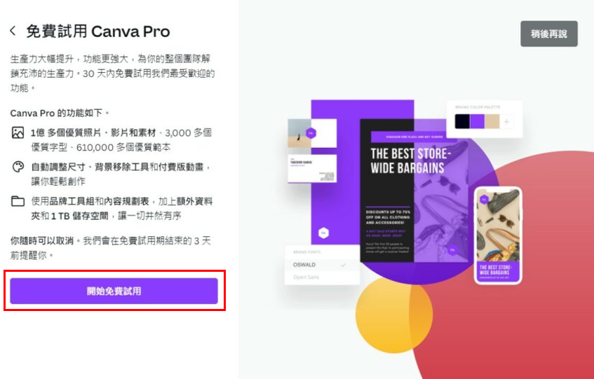 進入後點選Canva pro版免費試用(不會先扣款),也可以直接購買Canva pro,