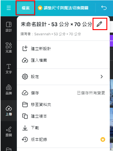 進入設計後,選擇左上角的「檔案」,點選「鉛筆」編輯可修改檔案名稱