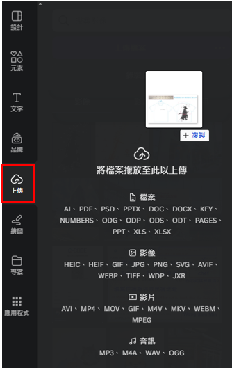 點選左側黑底欄位的「上傳」,便可把自備的圖片上傳到Canva (這裡的上傳並不是