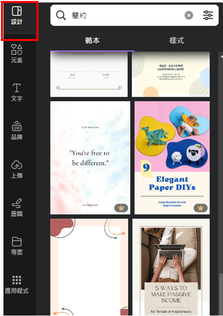 也可以左側黑底欄位的「設計」選擇喜歡的模板為範本