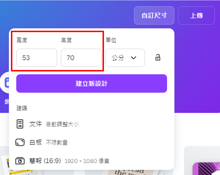 登入Canva後畫面右上角選擇「自訂尺寸」(單位公分或公釐),長寬要與實際尺寸
