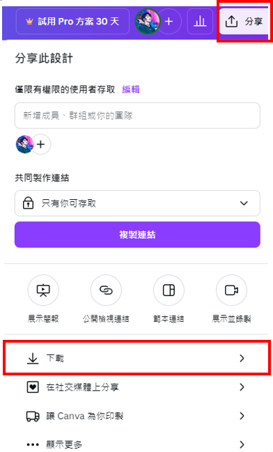 檔案做好後存檔點擊右上角「分享」→「下載」