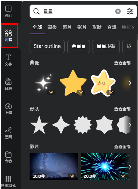 若沒有自備的圖片也可以使用Canva提供的圖片、照片。點選左側黑底欄位中的「元素」,有各種的「線條」、「圖像」、「貼圖」、「照片」等素材可搜尋挑選;不過這邊也建議使用英文找尋會更為準確。